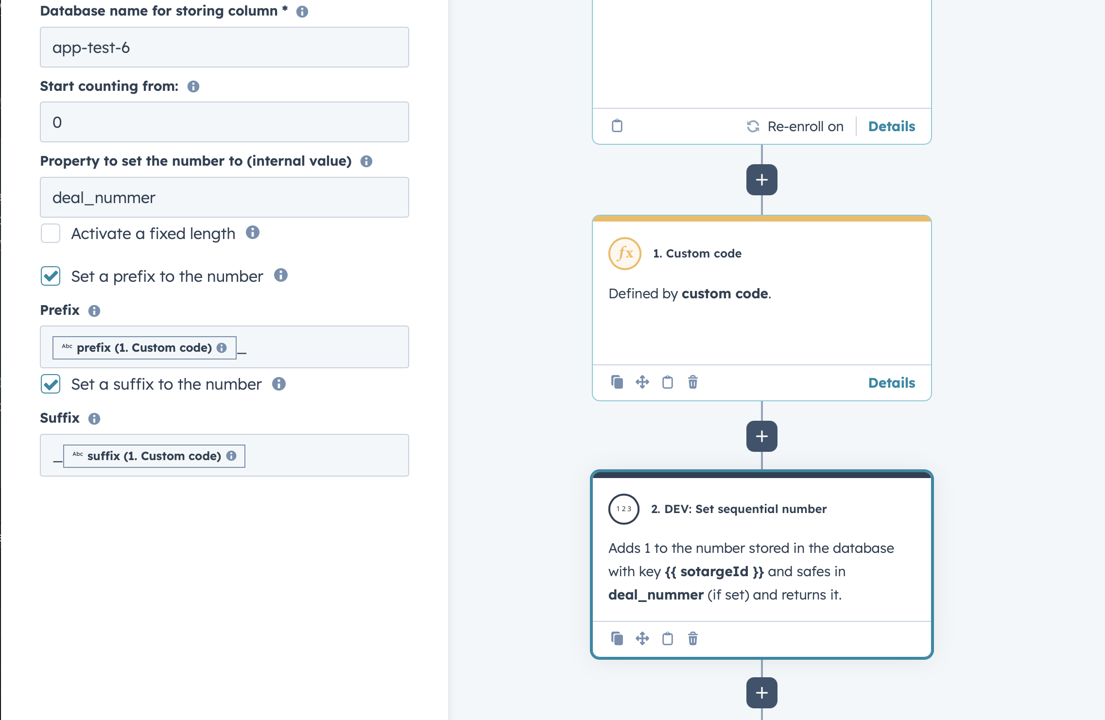 Database name for storing column: This is an arbitrary value associated with the sequential number. This is the key we save your current number in our database to. If you want to use the same number in an additional workflow, you can just set it to the same value. If you want to have multiple sequential numbers, just set this to different values.