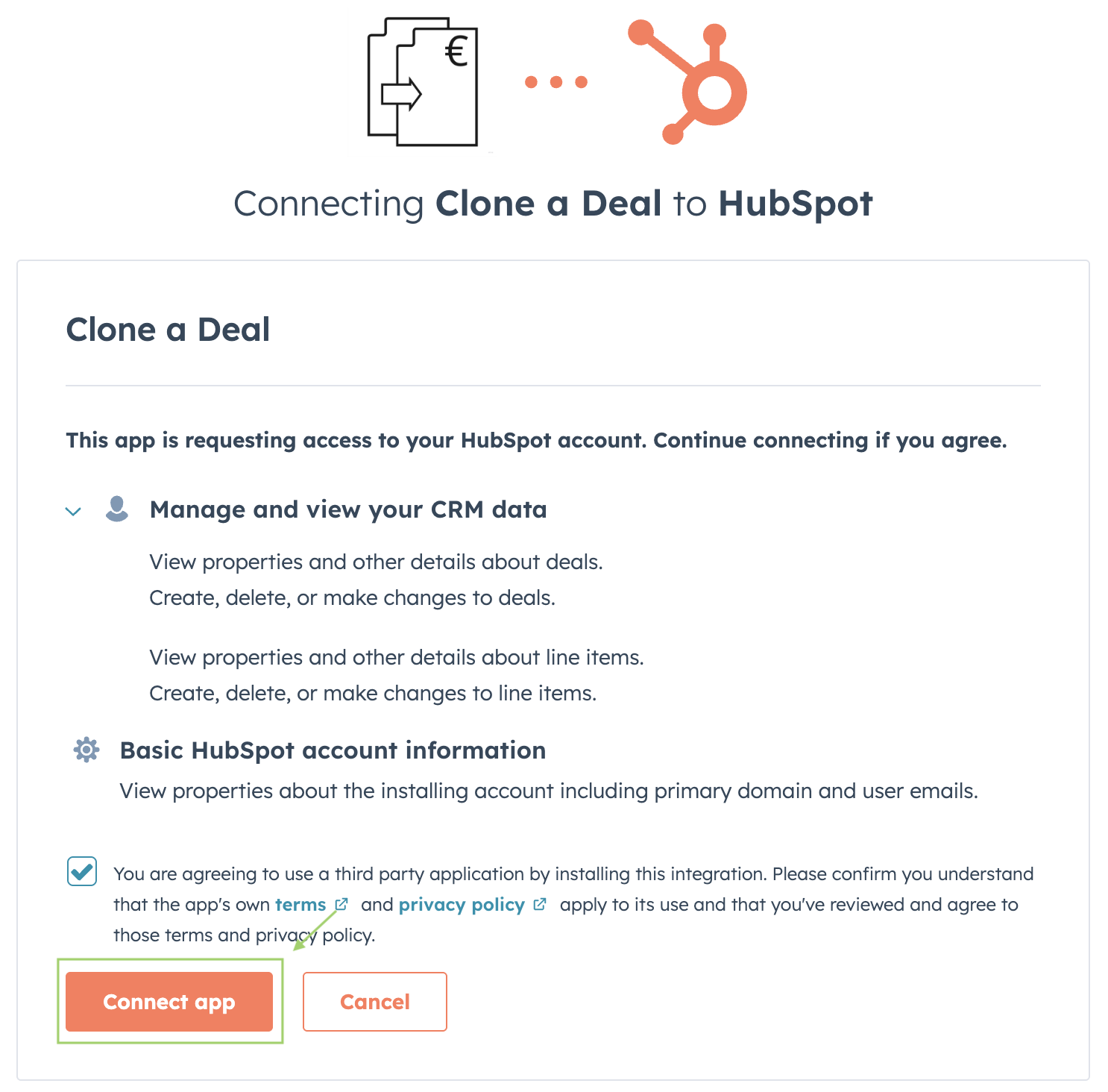 Step 1: To initially install the app and get your 14-day free trial, please click the following link https://apps.baskey.eu/dealcloning/install and follow the instructions presented below or get it directly through the app marketplace.
