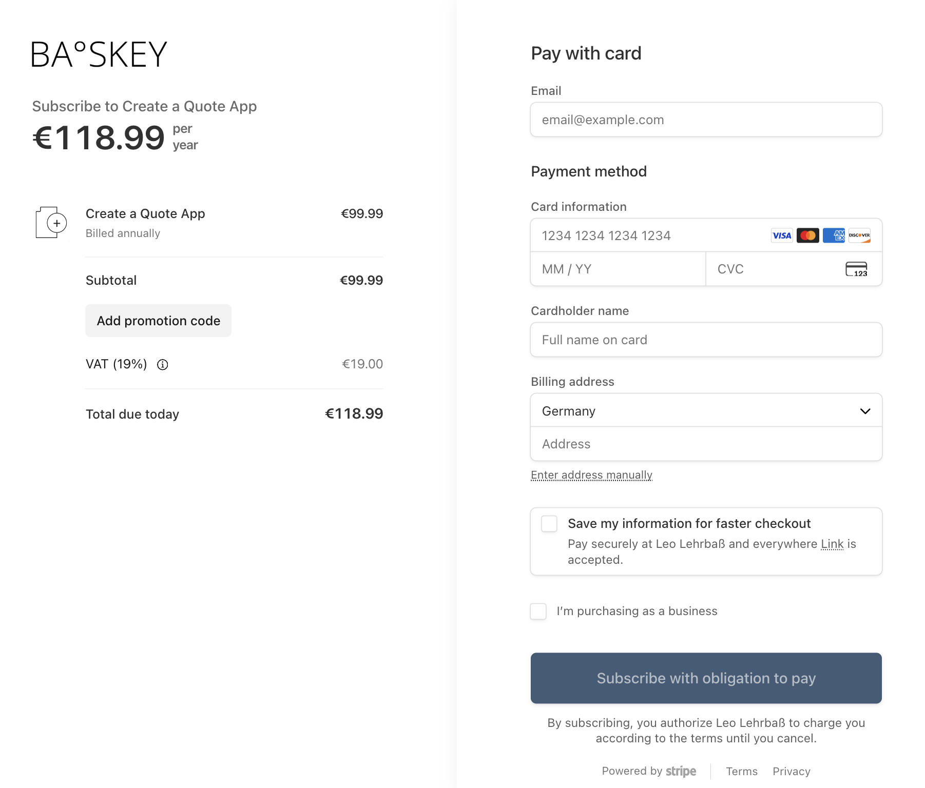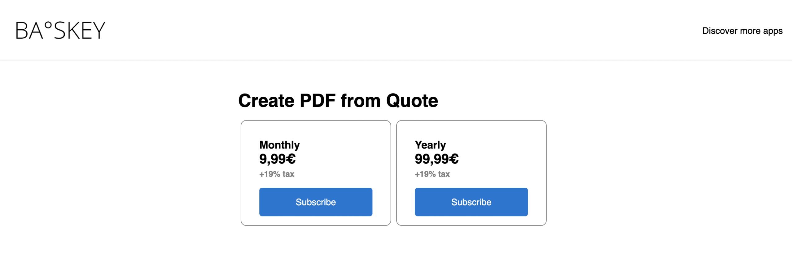Step 1: To initially install the app and get your 14-day free trial, please click the following link https://apps.baskey.eu/quotepdf/install and follow the instructions presented below or get it directly through the app marketplace.